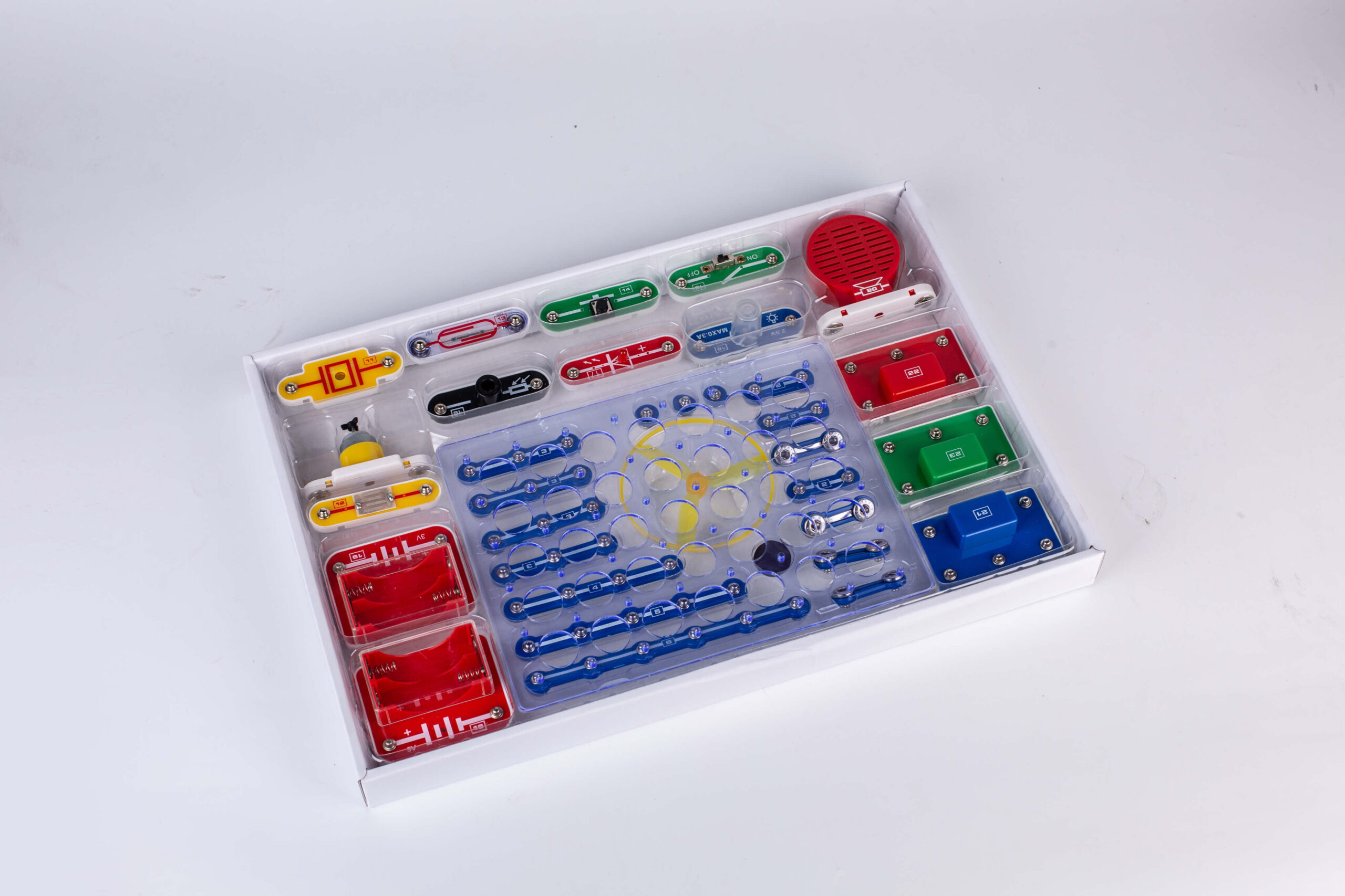 Includes: Plastic base grid, snap wires, IC modules, switches, speaker, LED, motor, and comprehensive manual